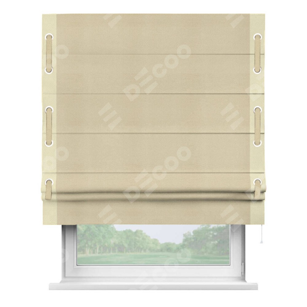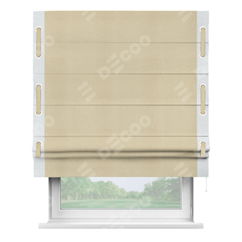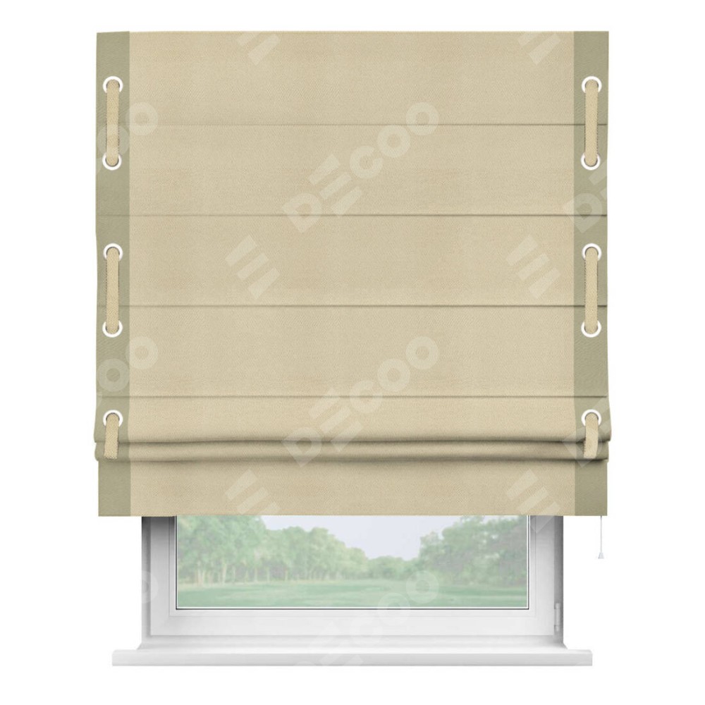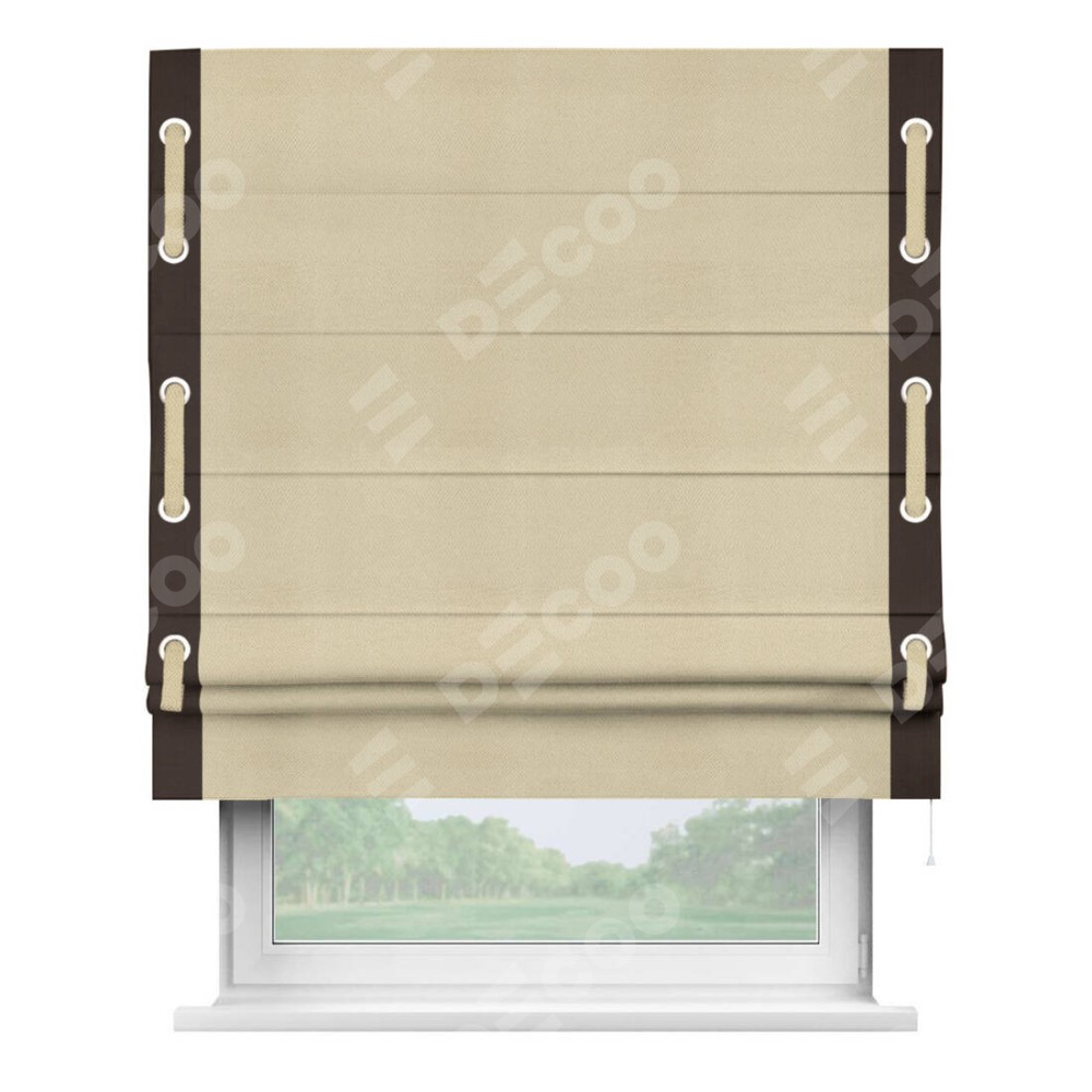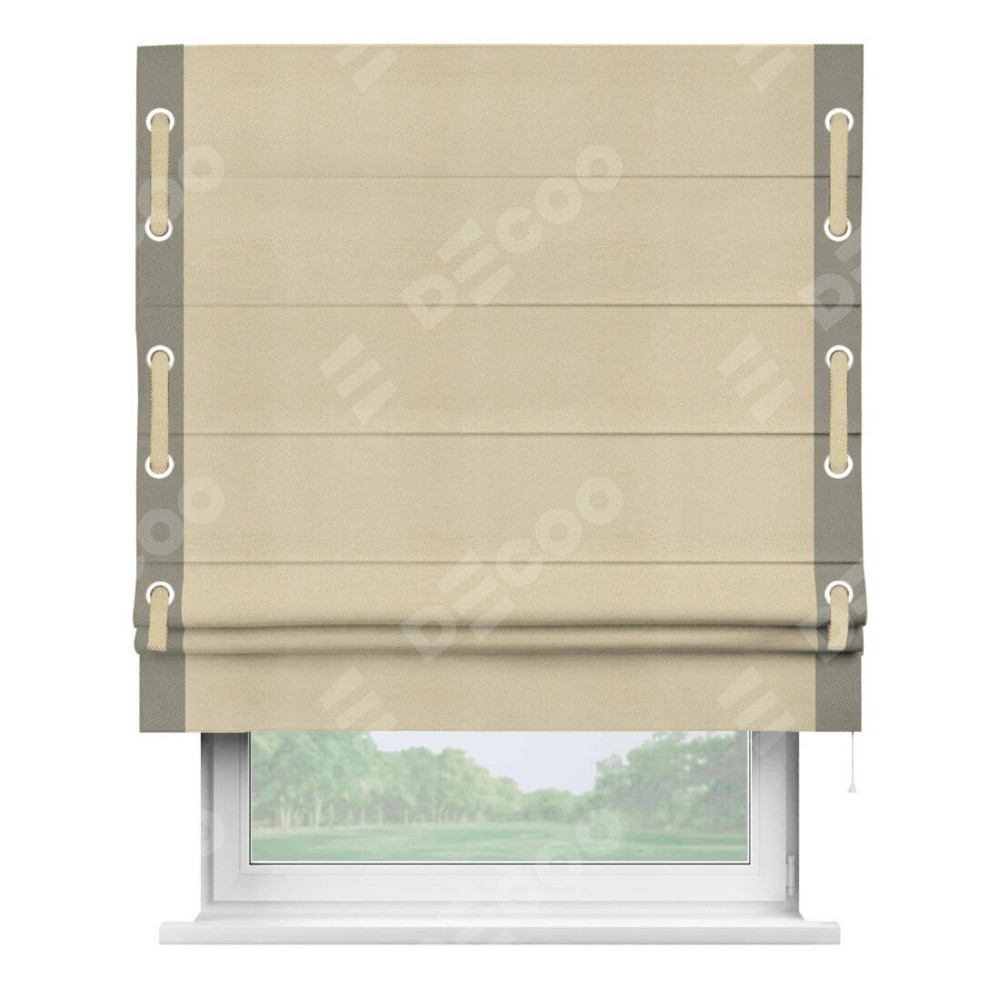 Римская штора производителя «Cortin», используется для проёма, пошита из ткани блэкаут однотонный милано латте, артикул ткани 05. Отделка шторы кантом «Стрим Дуо» на кантах расположены люверсы с пояском, ткань для канта используется из блэкаута однотонного разной расцветки на выбор. Ткань для пояска обычно используется из основной ткани шторы, а так же можно сделать из любой расцветки по желанию. Имеет универсальный механизм и подходит для монтажа: на потолок, на стену и в нишу.