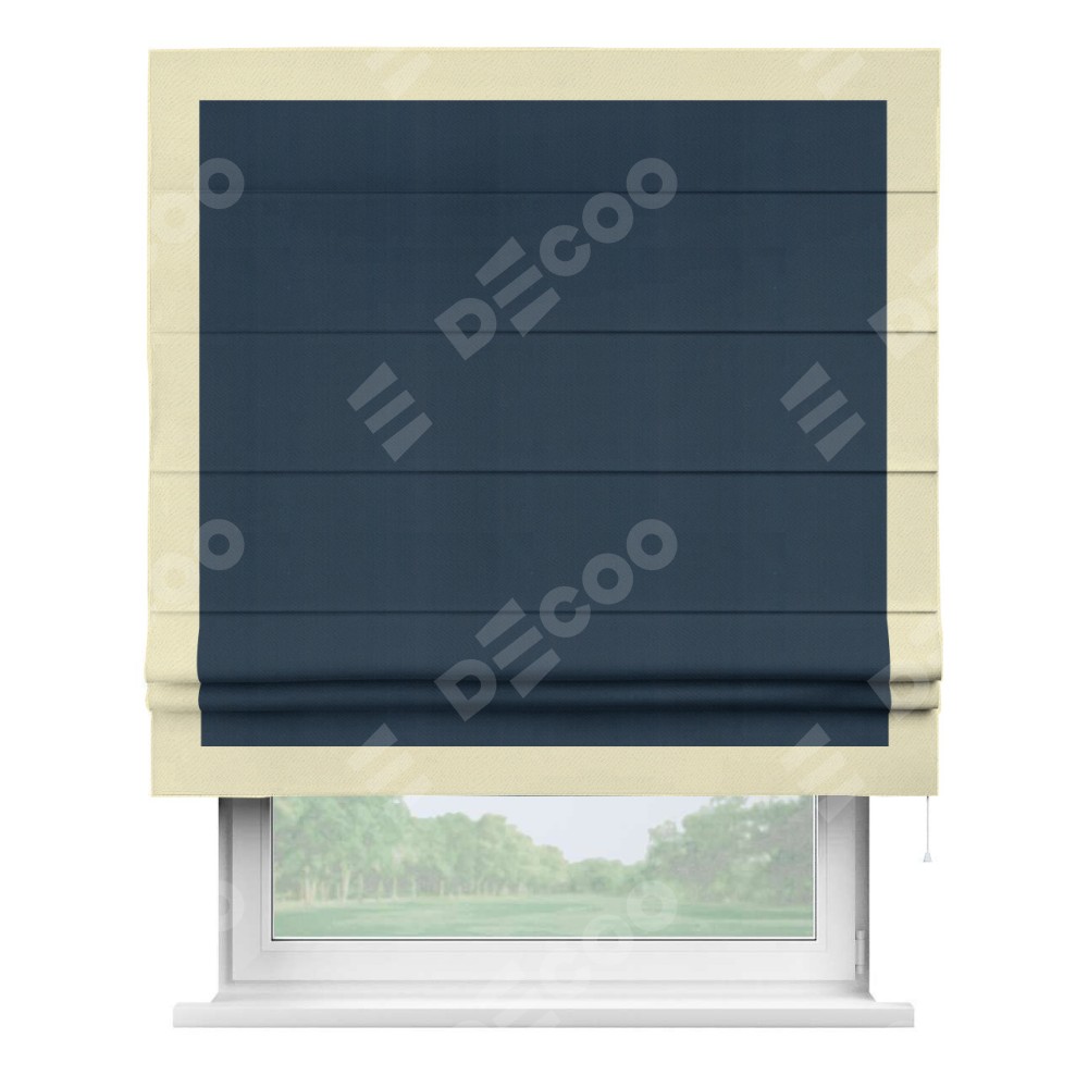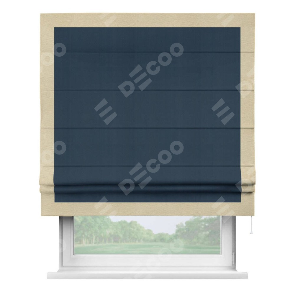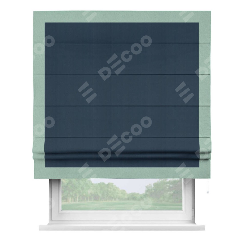 Римская штора производителя «Cortin», используется для проёма, пошита из ткани блэкаут однотонный синий, артикул ткани 29327. Отделка шторы кантом «Чесс», ткань для канта используется из блэкаута однотонного разной расцветки на выбор. Имеет универсальный механизм и подходит для монтажа: на потолок, на стену и в нишу.