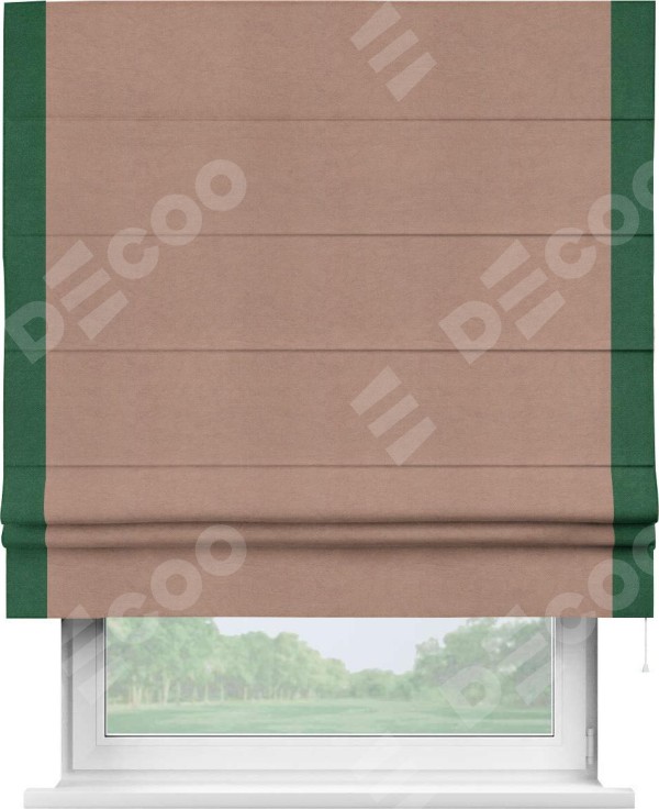 Римская штора производителя «Cortin», используется для проёма, пошита из ткани вельвет брусничный джем, артикул ткани 17750. Отделка шторы кантом «Стрим Дуо», ткань для канта используется из вельвета разной расцветки на выбор. Имеет универсальный механизм и подходит для монтажа: на потолок, на стену и в нишу.