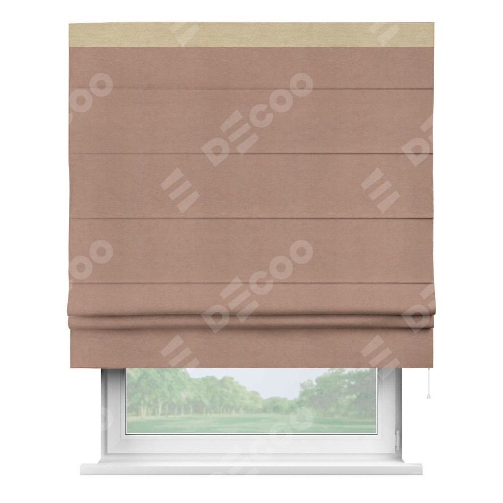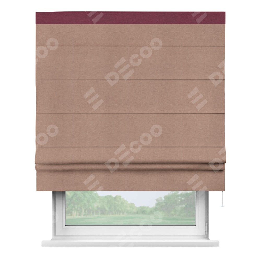 Римская штора производителя «Cortin», используется для проёма, пошита из ткани вельвет брусничный джем, артикул ткани 17750. Отделка шторы кантом «Кинг», ткань для канта используется из вельвета разной расцветки на выбор. Имеет универсальный механизм и подходит для монтажа: на потолок, на стену и в нишу.