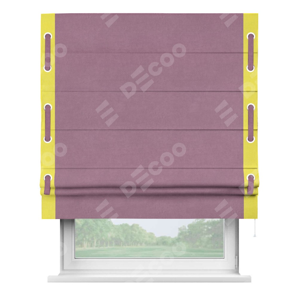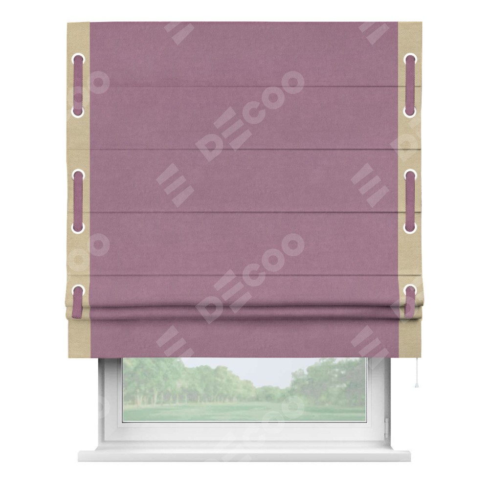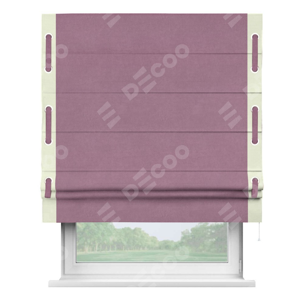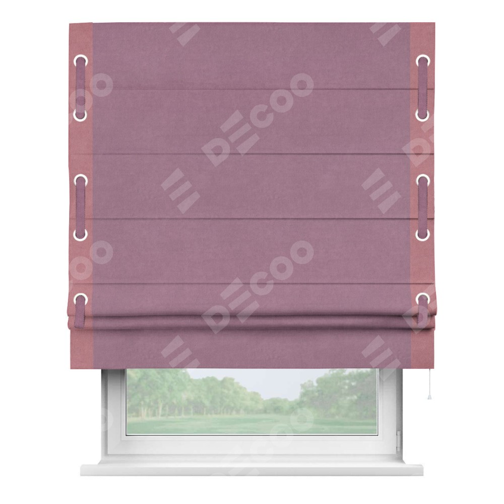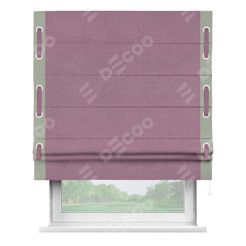 Римская штора производителя «Cortin», используется для проёма, пошита из ткани вельвет лиловый, артикул ткани 17752. Отделка шторы кантом «Стрим Дуо» на кантах расположены люверсы с пояском, ткань для канта используется из вельвета разной расцветки на выбор. Ткань для пояска обычно используется из основной ткани шторы, а так же можно сделать из любой расцветки по желанию. Имеет универсальный механизм и подходит для монтажа: на потолок, на стену и в нишу.