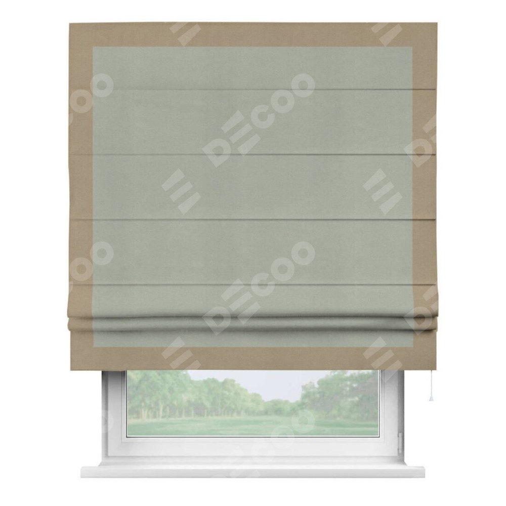 Римская штора производителя «Cortin», используется для проёма, пошита из ткани вельвет cветло-серый, артикул ткани 30980. Отделка шторы кантом «Чесс», ткань для канта используется из вельвета разной расцветки на выбор. Имеет универсальный механизм и подходит для монтажа: на потолок, на стену и в нишу.