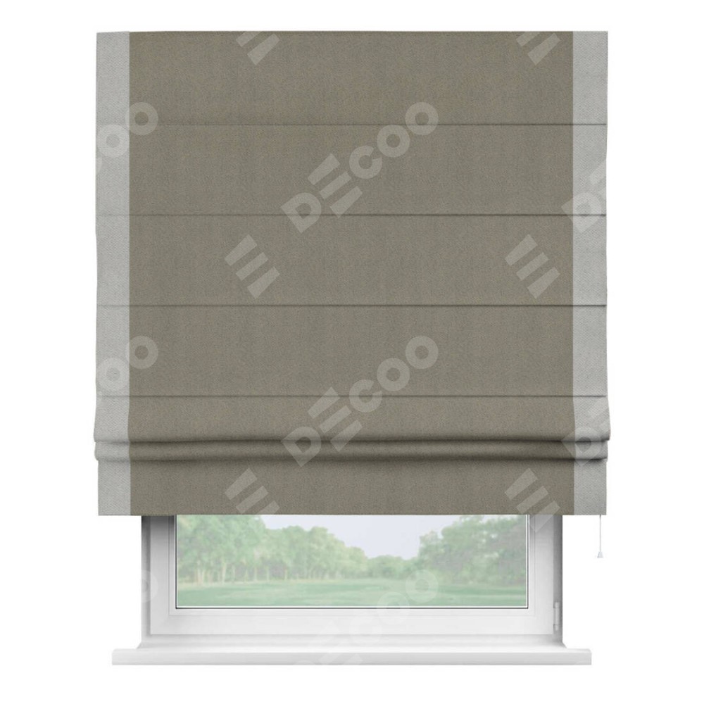 Римская штора производителя «Cortin», используется для проёма, пошита из ткани блэкаут с блеском графитовый, артикул 34648. Отделка шторы кантом «Стрим Дуо», ткань для канта используется из блэкаута с блеском разной расцветки на выбор. Изнаночная сторона материала черного цвета, что обеспечивает необходимую светонепроницаемость. Имеет универсальный механизм и подходит для монтажа: на потолок, на стену и в нишу.