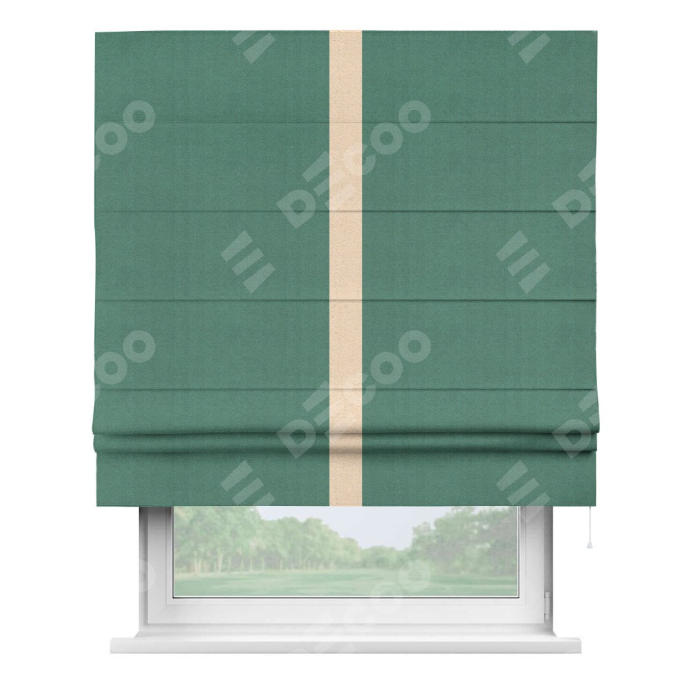 Римская штора производителя «Cortin», используется для проёма, пошита из ткани блэкаут с блеском изумрудный, артикул 34628. Отделка шторы кантом «Хайвэй», ткань для канта используется из блэкаута с блеском разной расцветки на выбор. Изнаночная сторона материала черного цвета, что обеспечивает необходимую светонепроницаемость. Имеет универсальный механизм и подходит для монтажа: на потолок, на стену и в нишу.