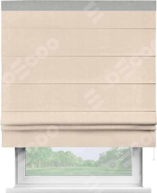Римская штора производителя «Cortin», используется для проёма, пошита из ткани блэкаут с блеском розовая пудра, артикул 34632. Отделка шторы кантом «Кинг», ткань для канта используется из блэкаута с блеском разной расцветки на выбор. Изнаночная сторона материала черного цвета, что обеспечивает необходимую светонепроницаемость. Имеет универсальный механизм и подходит для монтажа: на потолок, на стену и в нишу.