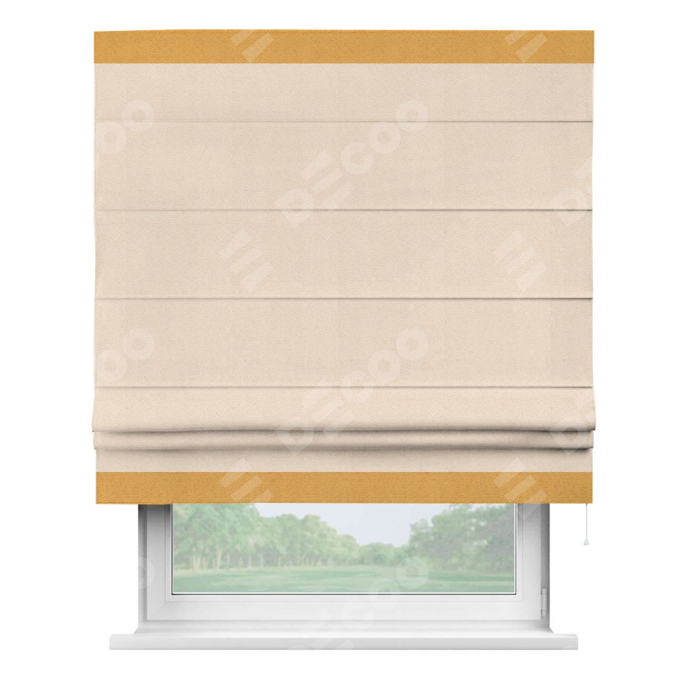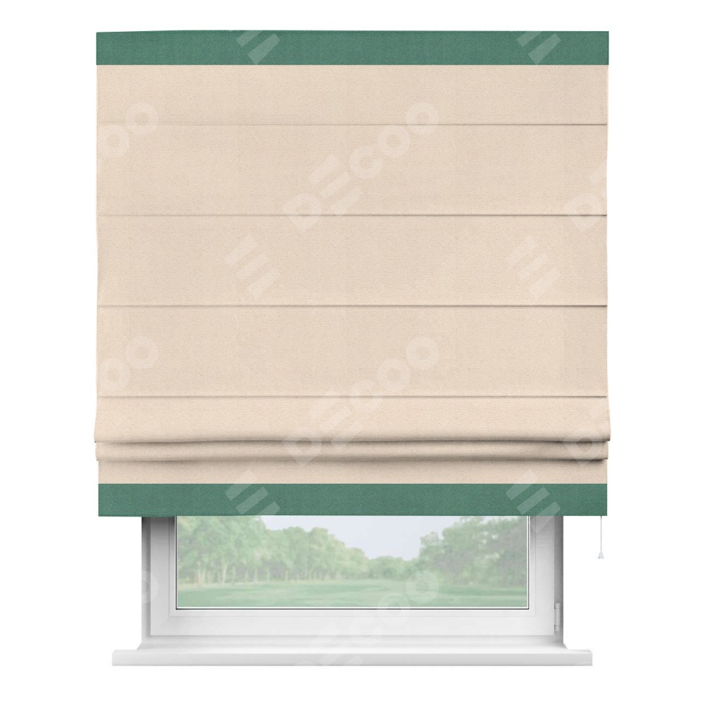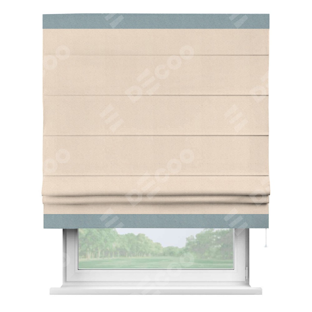 Римская штора производителя «Cortin», используется для проёма, пошита из ткани блэкаут с блеском розовая пудра, артикул 34632. Отделка шторы кантом «Горизонт», ткань для канта используется из блэкаута с блеском разной расцветки на выбор. Изнаночная сторона материала черного цвета, что обеспечивает необходимую светонепроницаемость. Имеет универсальный механизм и подходит для монтажа: на потолок, на стену и в нишу.