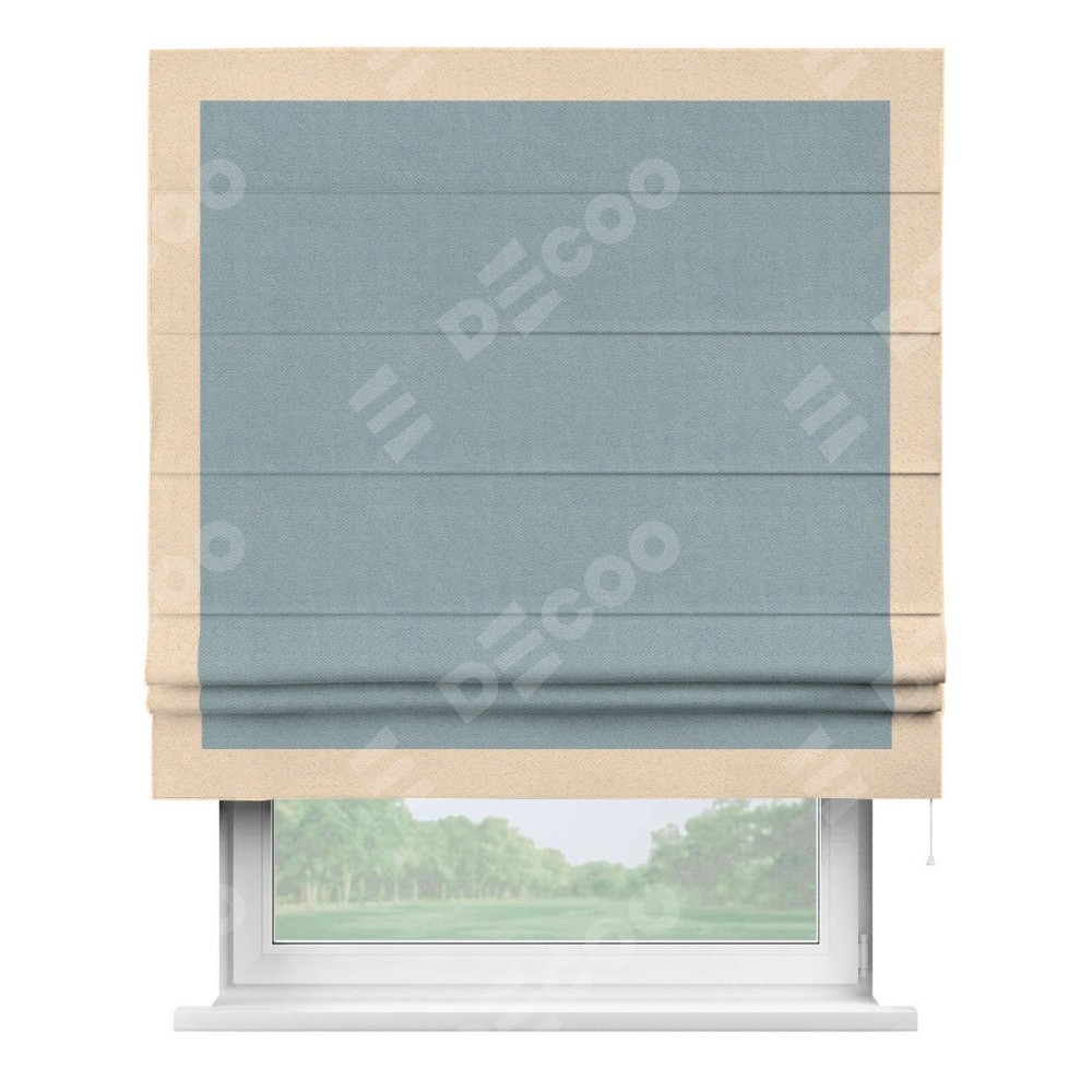 Римская штора производителя «Cortin», используется для проёма, пошита из ткани блэкаут с блеском синий, артикул 34625. Отделка шторы кантом «Чесс», ткань для канта используется из блэкаута с блеском разной расцветки на выбор. Изнаночная сторона материала черного цвета, что обеспечивает необходимую светонепроницаемость. Имеет универсальный механизм и подходит для монтажа: на потолок, на стену и в нишу.