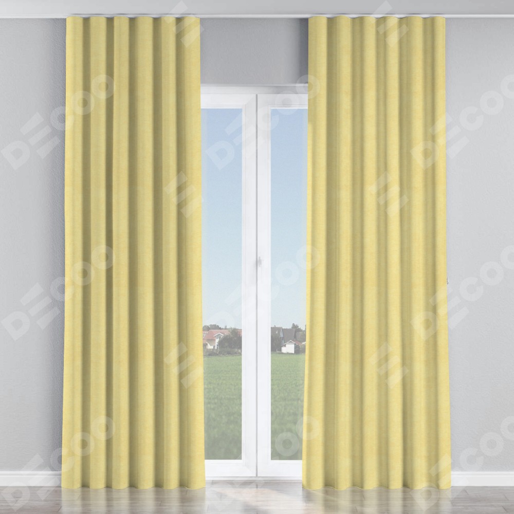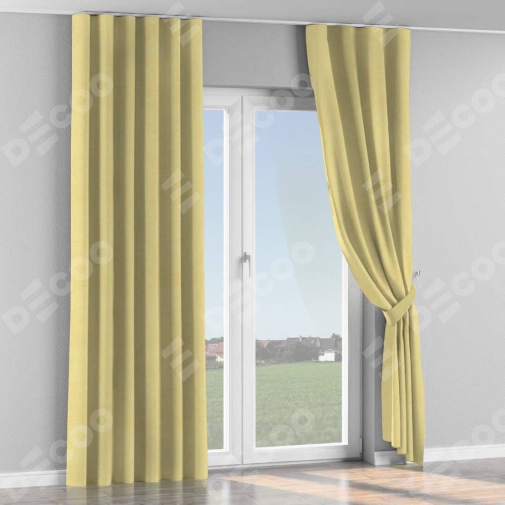 Комплект прямых штор, от производителя «Cortin», пошиты из ткани софт однотонный золотой, артикул ткани 42934. С изнаночной стороны в верхней части штор пристрачивается шторная лента с декоративными складками «Волна». Для создания элегантных складок прямые шторы шьются по стандарту с коэффициентом 1:2 (на 100 см. ширины проёма 200 см. ширины ткани).
