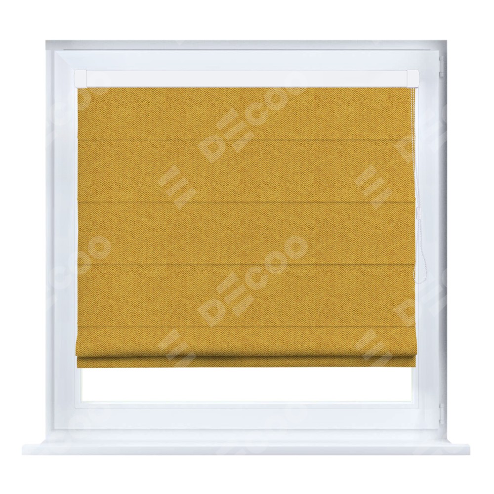 Римская штора кассетного типа, производителя «Cortin», устанавливается только на пластиковые окна и прилегает к стеклопакету, пошита из ткани твид блэкаут медово-желтый, артикул 21641.