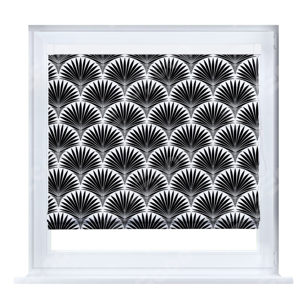 Римская штора производителя «Cortin», устанавливается на створку окна, пошита из ткани блэкаут с нанесением сублимационной печати «Арт-деко листья черный». Штора шьётся по индивидуальным размерам, для данного типа римской шторы возможная ширина от 35 до 150 см., высота до 250 см.