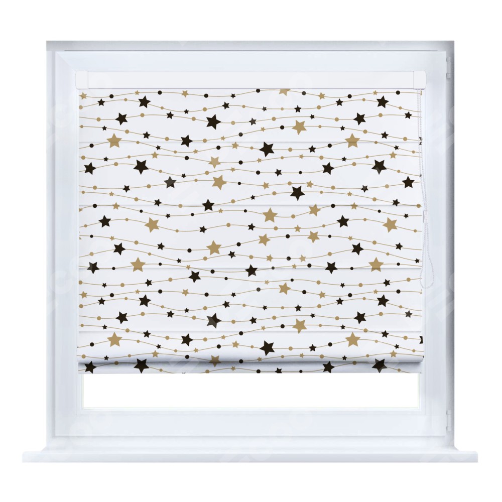 Римская штора производителя «Cortin», устанавливается на створку окна, пошита из ткани блэкаут с нанесением сублимационной печати «Звёздная нить». Штора шьётся по индивидуальным размерам, для данного типа римской шторы возможная ширина от 35 до 150 см., высота до 250 см.
