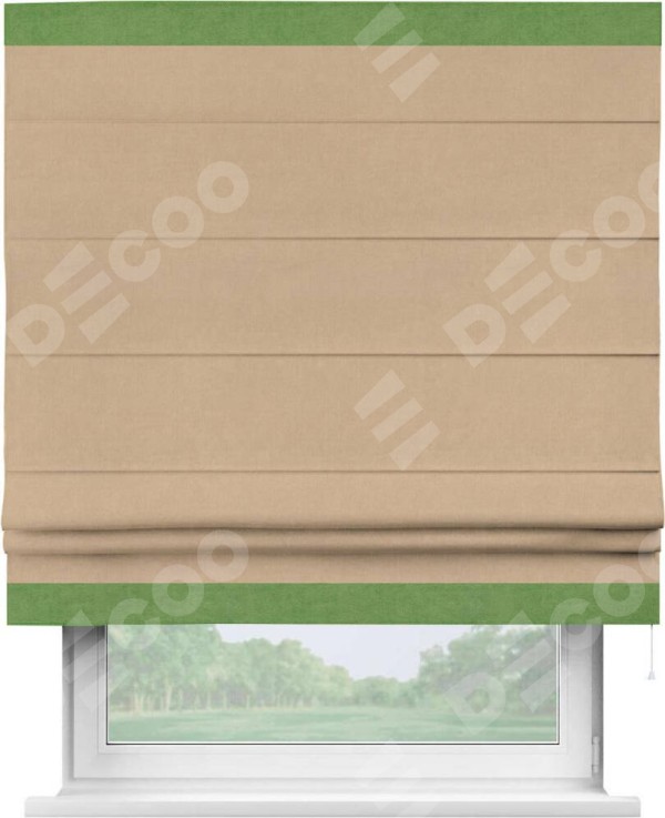Римская штора производителя «Cortin», используется для проёма, пошита из ткани вельвет песочный, артикул ткани 17740. Отделка шторы кантом «Горизонт», ткань для канта используется из вельвета разной расцветки на выбор. Имеет универсальный механизм и подходит для монтажа: на потолок, на стену и в нишу.