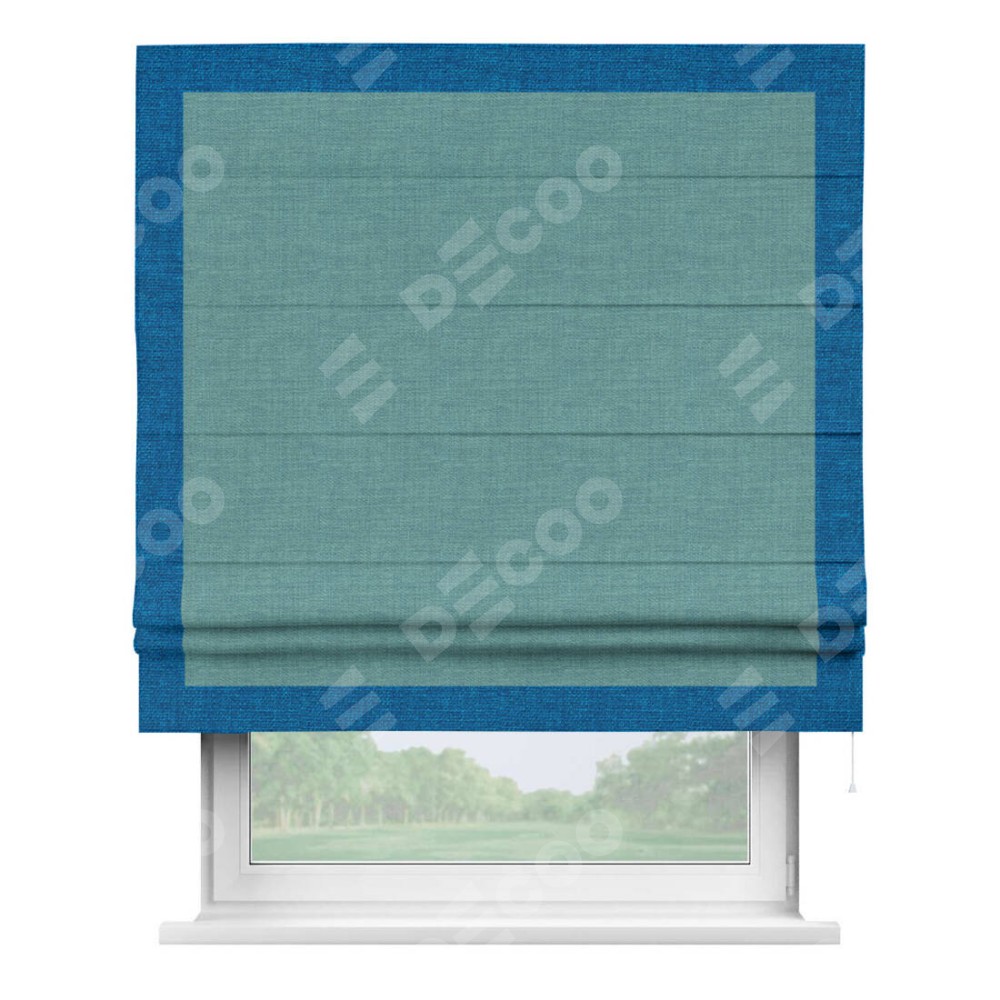 Римская штора производителя «Cortin», используется для проёма, пошита из ткани лён бирюза, артикул 7446. Отделка шторы кантом «Чесс», ткань для канта используется из льна разной расцветки на выбор. Имеет универсальный механизм и подходит для монтажа: на потолок, на стену и в нишу.