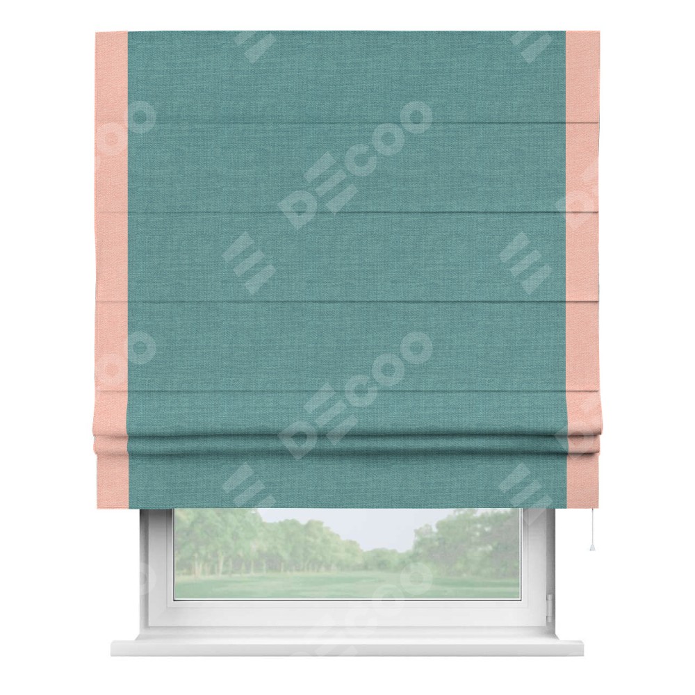 Римская штора производителя «Cortin», используется для проёма, пошита из ткани лён бирюза, артикул 7446. Отделка шторы кантом «Стрим Дуо», ткань для канта используется из льна разной расцветки на выбор. Имеет универсальный механизм и подходит для монтажа: на потолок, на стену и в нишу.