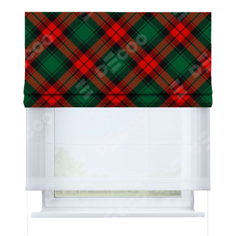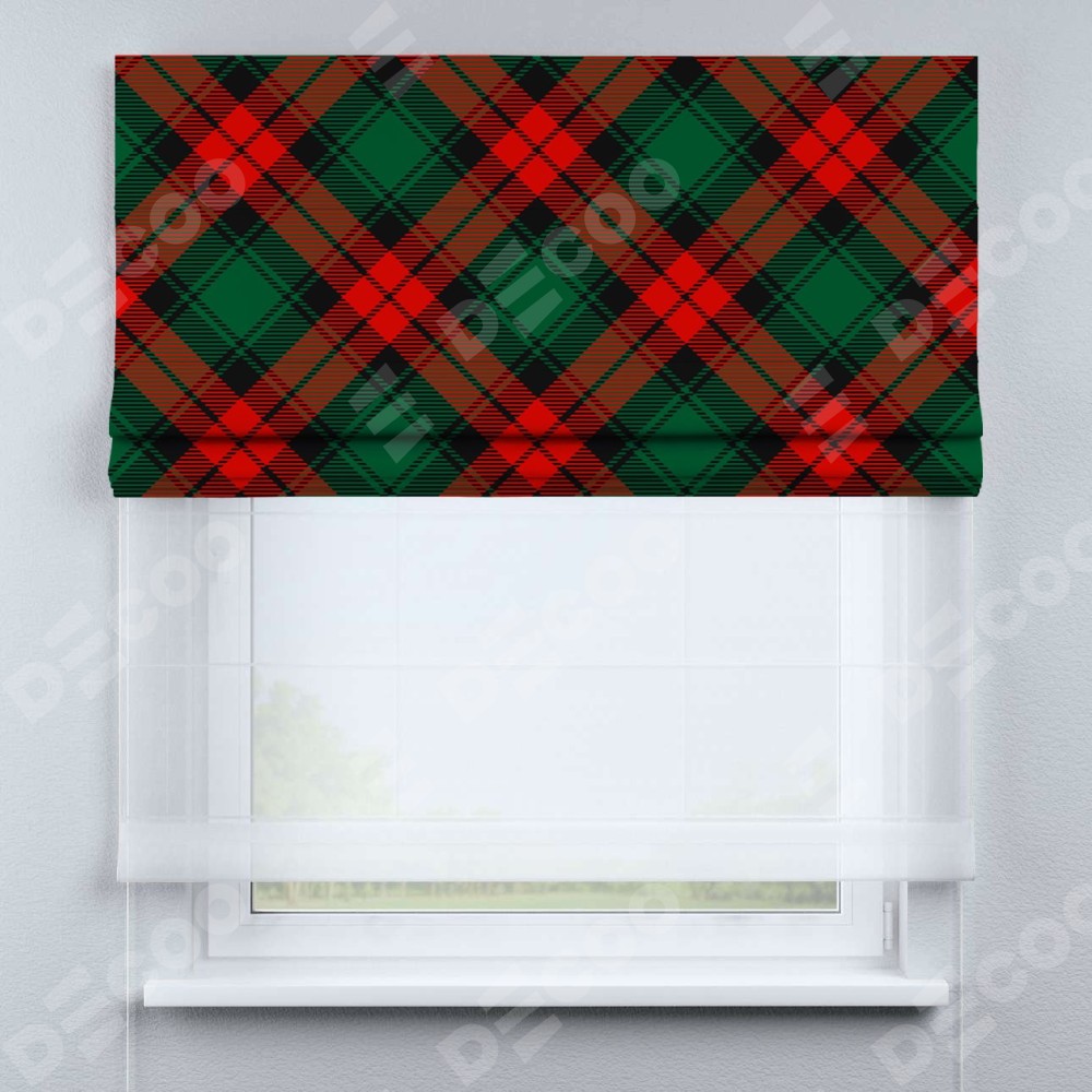 Римская штора день-ночь производителя «Cortin», используется для проёма, пошита из двух полотен, с лицевой блэкаут с нанесением сублимационной печати «Красно-зелёная клетка», вторая ткань тюль (по стандарту комплектуется тюль белого цвета артикул V-01). Имеет универсальный механизм и подходит для монтажа: на потолок, на стену и в нишу.