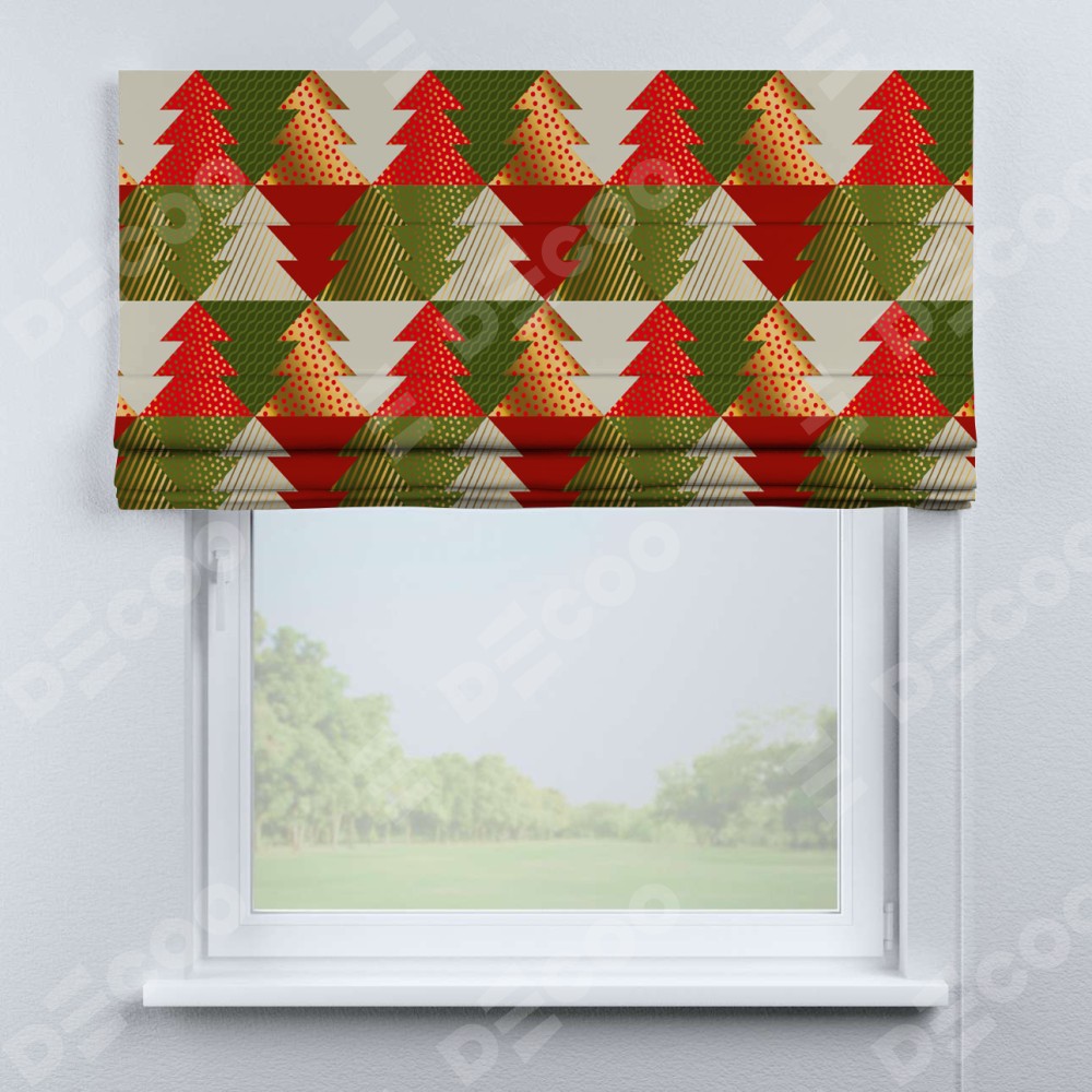Римская штора производителя «Cortin», используется для проёма, пошита из ткани блэкаут с нанесением сублимационной печати «Новогоднее украшение». Имеет универсальный механизм и подходит для монтажа: на потолок, на стену и в нишу.