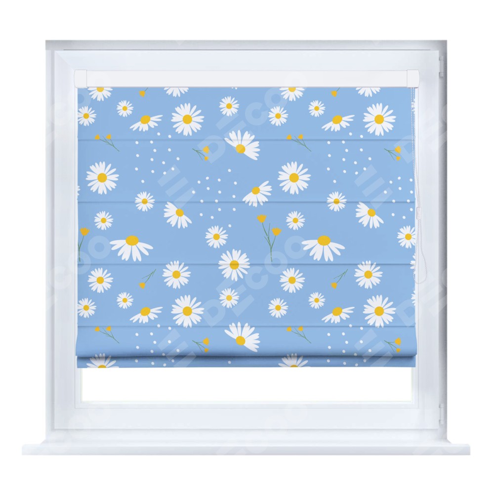 Римская штора производителя «Cortin», устанавливается на створку окна, пошита из ткани блэкаут с нанесением сублимационной печати «Ромашки на голубом». Штора шьётся по индивидуальным размерам, для данного типа римской шторы возможная ширина от 35 до 150 см., высота до 250 см.