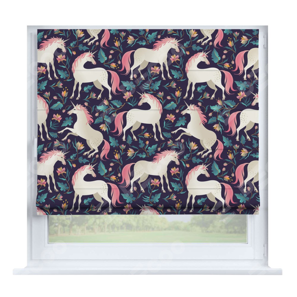 Римская штора производителя «Cortin», устанавливается на створку окна, пошита из ткани блэкаут с нанесением сублимационной печати «Сказочные единороги». Штора шьётся по индивидуальным размерам, для данного типа римской шторы возможная ширина от 35 до 150 см., высота до 250 см.