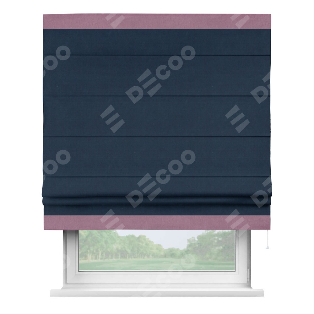 Римская штора производителя «Cortin», используется для проёма, пошита из ткани вельвет темно-синий, артикул ткани 14152. Отделка шторы кантом «Горизонт», ткань для канта используется из вельвета разной расцветки на выбор. Имеет универсальный механизм и подходит для монтажа: на потолок, на стену и в нишу.