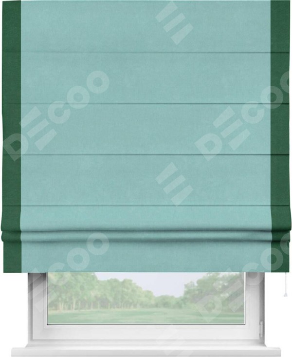 Римская штора производителя «Cortin», используется для проёма, пошита из ткани вельвет тиффани, артикул ткани 17765. Отделка шторы кантом «Стрим Дуо», ткань для канта используется из вельвета разной расцветки на выбор. Имеет универсальный механизм и подходит для монтажа: на потолок, на стену и в нишу.