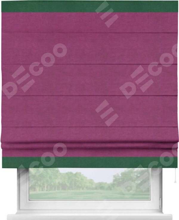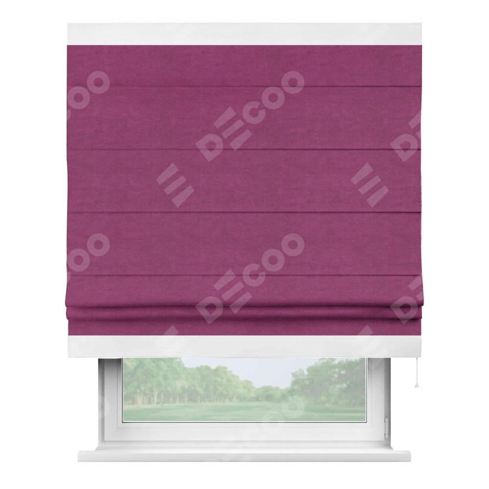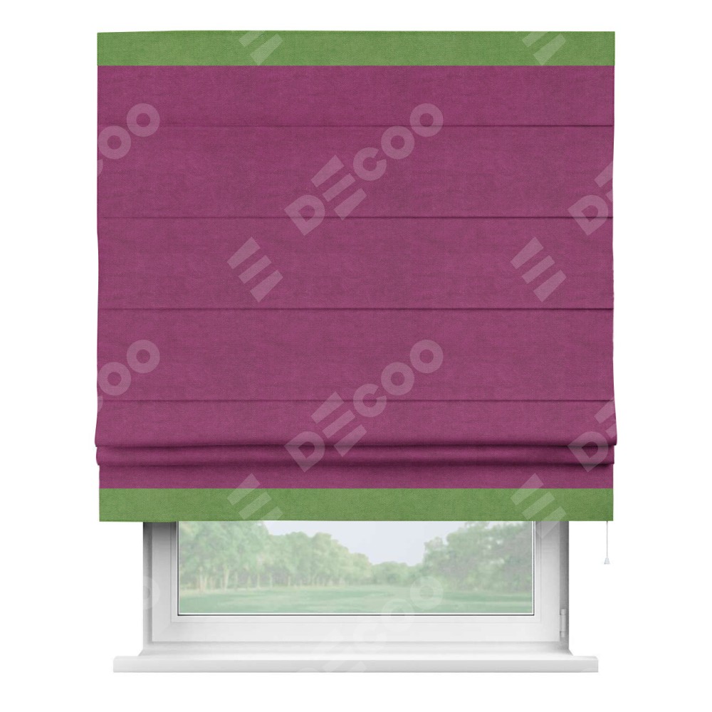 Римская штора производителя «Cortin», используется для проёма, пошита из ткани вельвет фиолетовый, артикул ткани 85552. Отделка шторы кантом «Горизонт», ткань для канта используется из вельвета разной расцветки на выбор. Имеет универсальный механизм и подходит для монтажа: на потолок, на стену и в нишу.