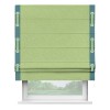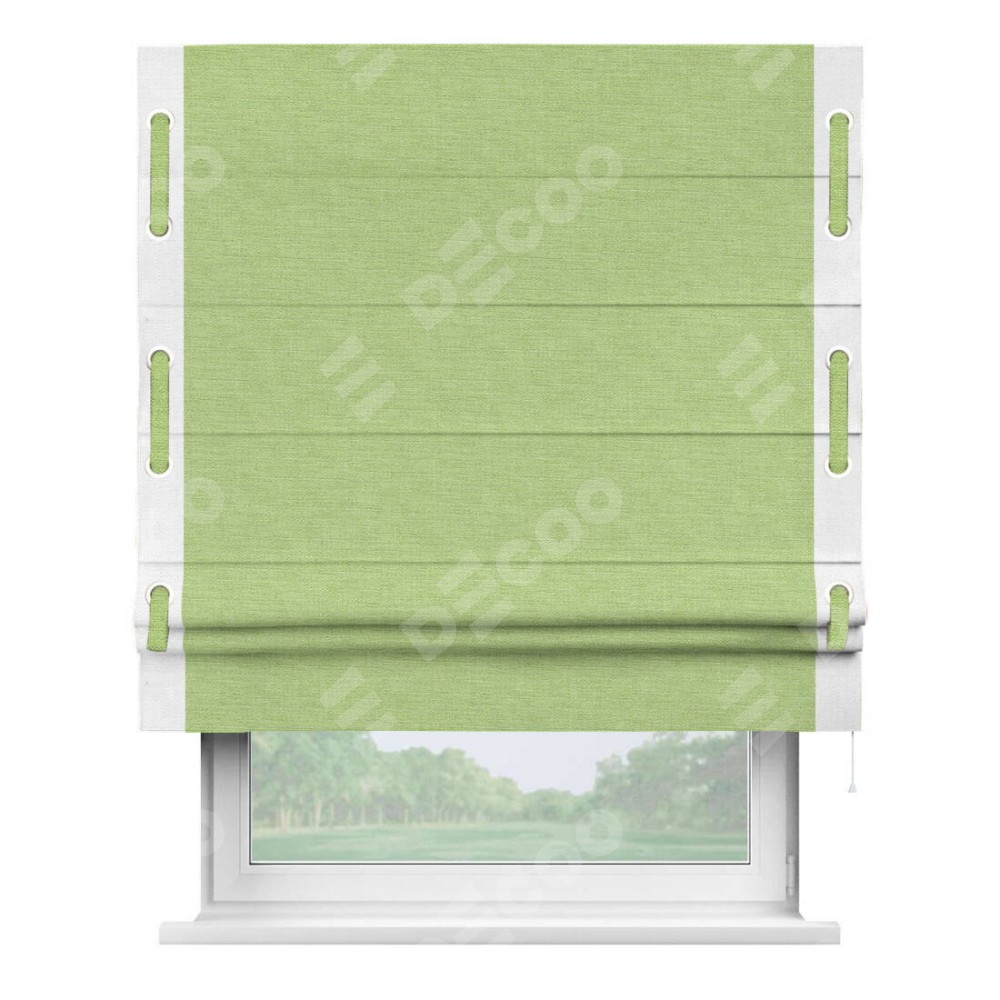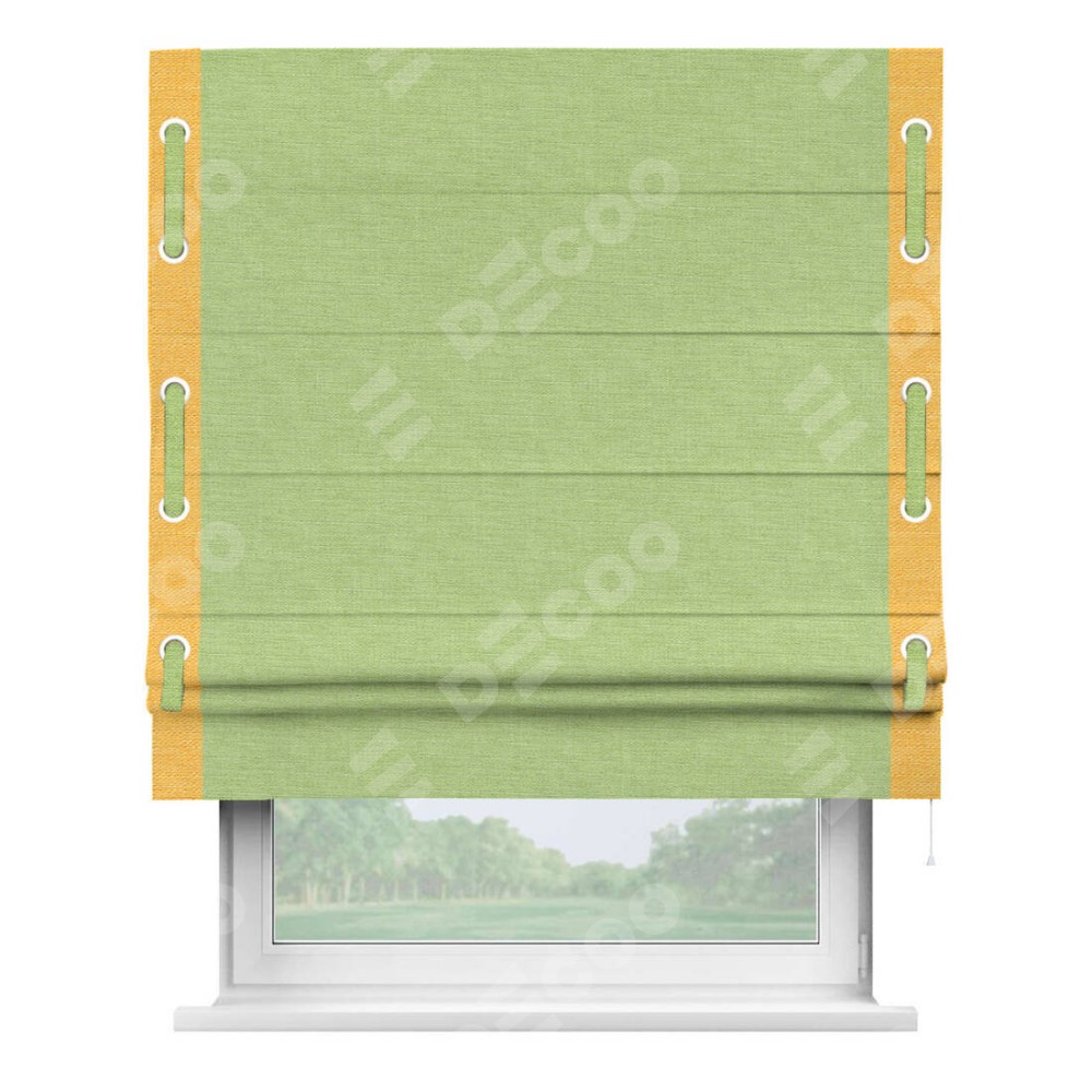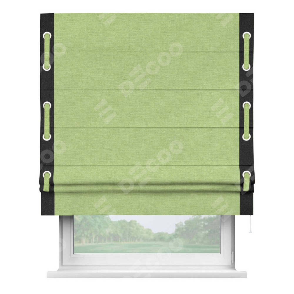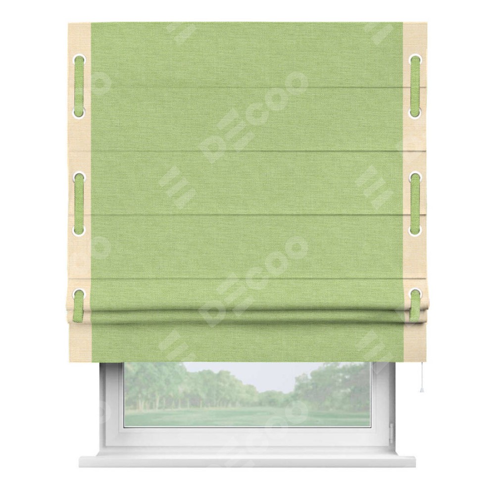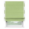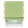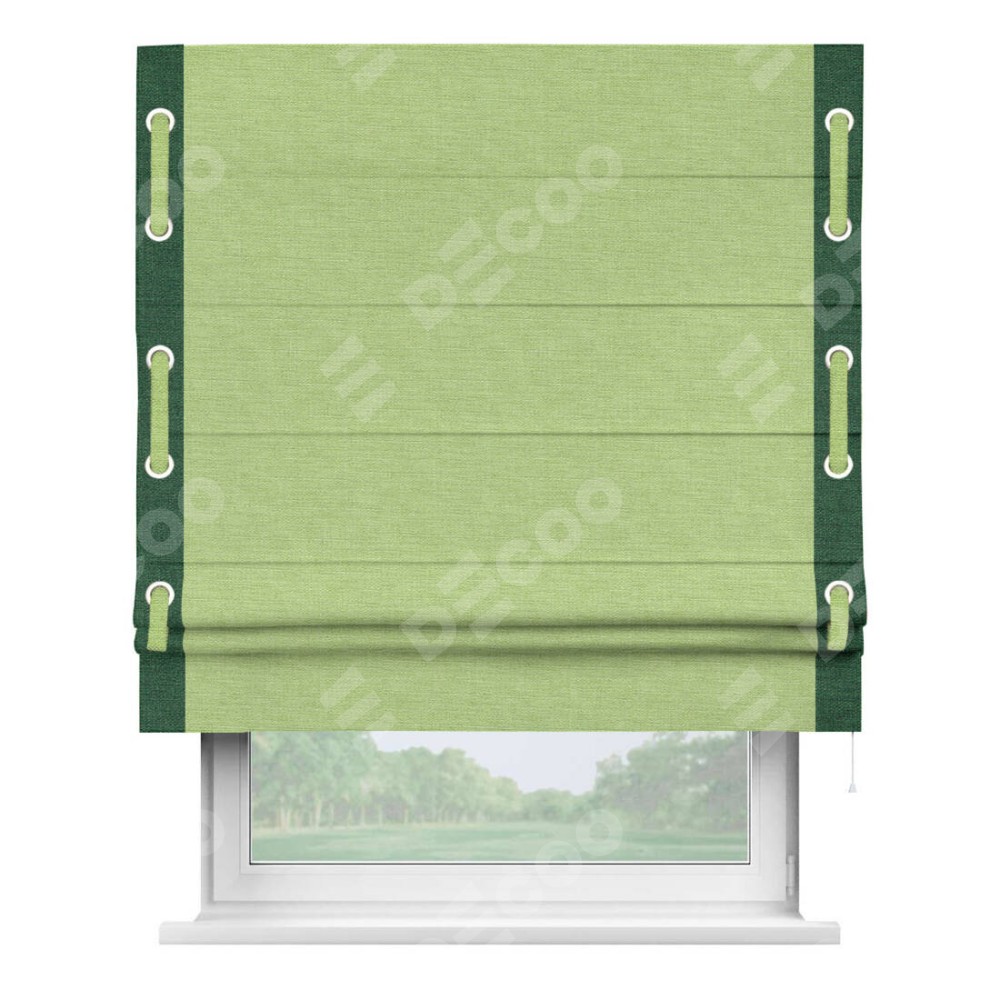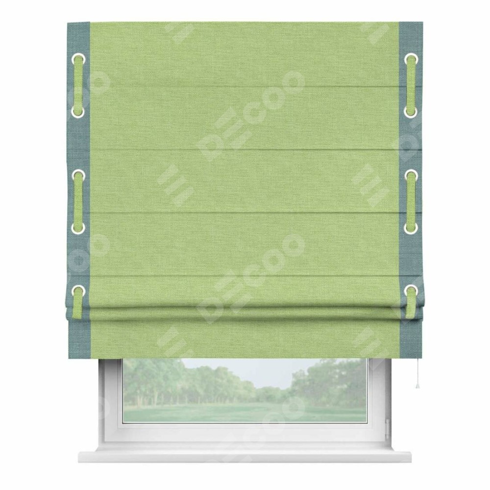 Римская штора производителя «Cortin», используется для проёма, пошита из ткани лён зеленый, артикул 85906. Отделка шторы кантом «Стрим Дуо» на кантах расположены люверсы с пояском, ткань для канта используется из льна разной расцветки на выбор. Ткань для пояска обычно используется из основной ткани шторы, а так же можно сделать из любой расцветки по желанию. Имеет универсальный механизм и подходит для монтажа: на потолок, на стену и в нишу.