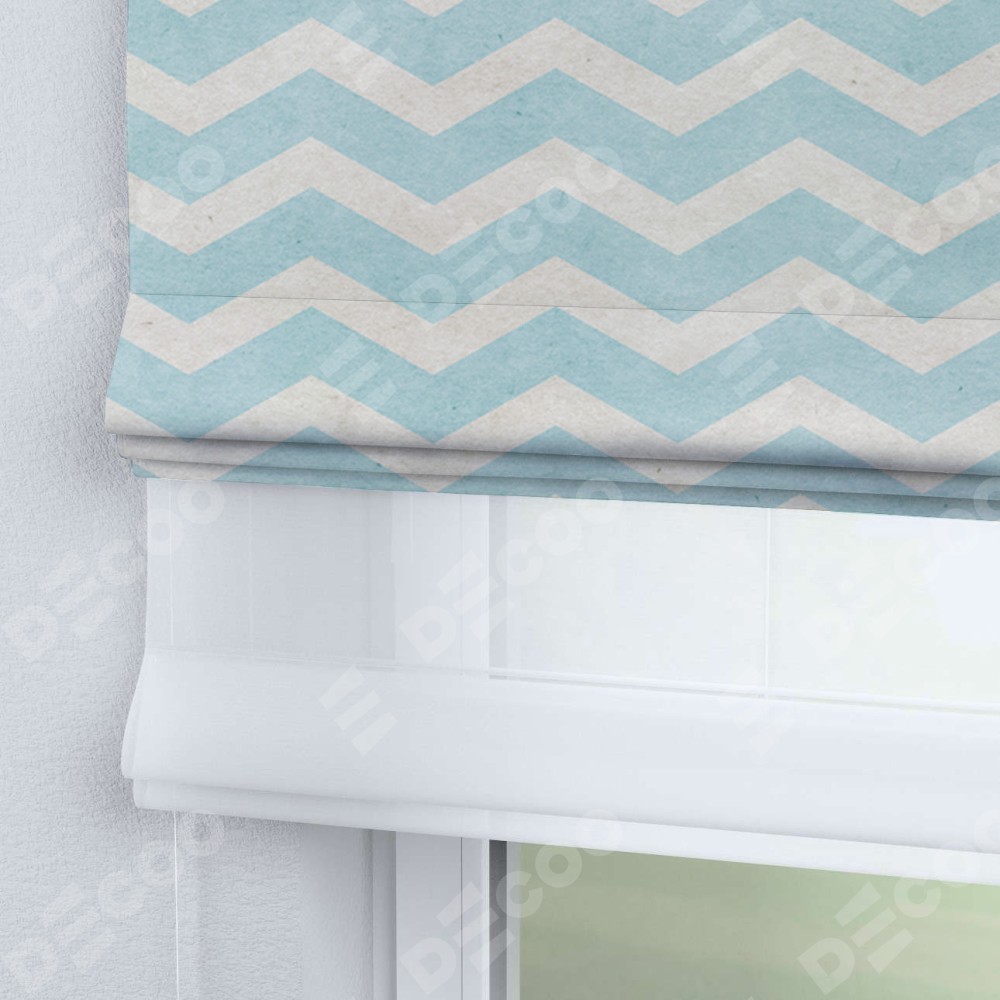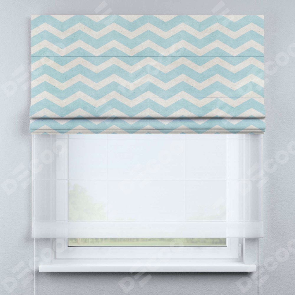 Римская штора день-ночь производителя «Cortin», используется для проёма, пошита из двух полотен, с лицевой блэкаут с нанесением сублимационной печати «Голубой шеврон», вторая ткань тюль (по стандарту комплектуется тюль белого цвета артикул V-01). Имеет универсальный механизм и подходит для монтажа: на потолок, на стену и в нишу.