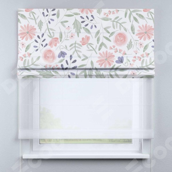 Римская штора день-ночь производителя «Cortin», используется для проёма, пошита из двух полотен, с лицевой блэкаут с нанесением сублимационной печати «Изысканные цветы», вторая ткань тюль (по стандарту комплектуется тюль белого цвета артикул V-01). Имеет универсальный механизм и подходит для монтажа: на потолок, на стену и в нишу.