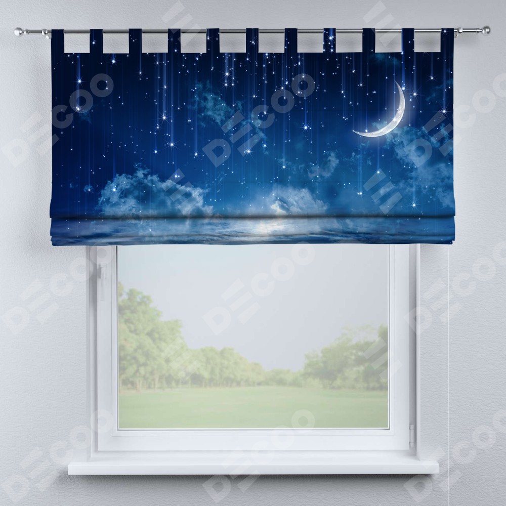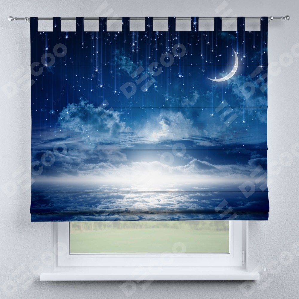 Римская штора производителя «Cortin», используется для проёма, пошита из ткани блэкаут с нанесением сублимационной печати «Ночное небо». Данная модель пошита на петлях, комплектуется на выбор круглым карнизом и подходит для монтажа на стену. Римская штора на петлях имеет простую систему регулировки высоты, отличительным преимуществом данной модели является простой способ монтажа. Достаточно повесить ее на трубу и штора готова!