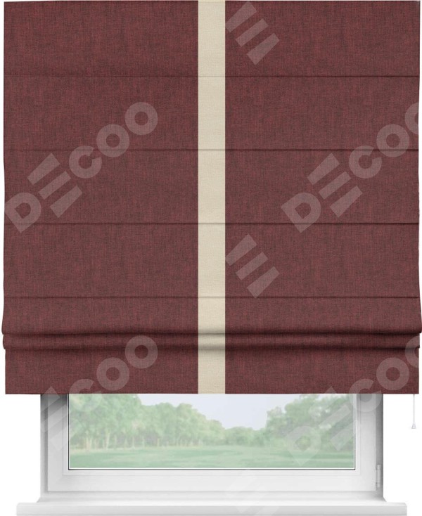 Римская штора производителя «Cortin», используется для проёма, пошита из ткани лён кашемир бордовый, артикул 17213. Отделка шторы кантом «Хайвэй», ткань для канта используется из льна разной расцветки на выбор. Имеет универсальный механизм и подходит для монтажа: на потолок, на стену и в нишу.