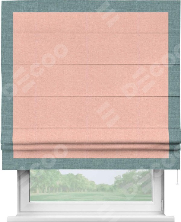 Римская штора производителя «Cortin», используется для проёма, пошита из ткани лён розовый, артикул 00005. Отделка шторы кантом «Чесс», ткань для канта используется из льна разной расцветки на выбор. Имеет универсальный механизм и подходит для монтажа: на потолок, на стену и в нишу.
