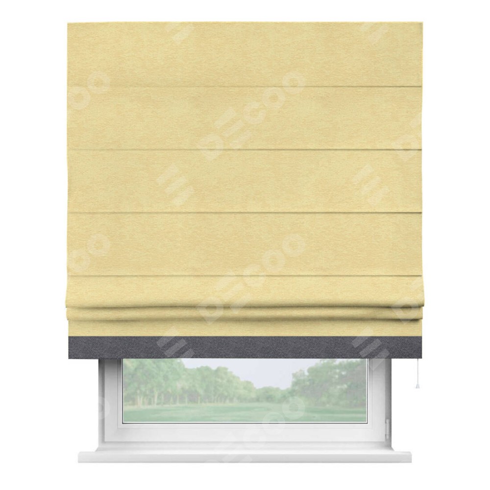 Римская штора производителя «Cortin», используется для проёма, пошита из ткани софт однотонный золотой, артикул 42934. Отделка шторы кантом «Джестер», ткань для канта используется из софта разной расцветки на выбор. Имеет универсальный механизм и подходит для монтажа: на потолок, на стену и в нишу.