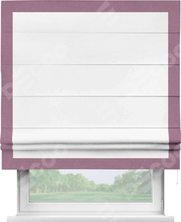 Римская штора производителя «Cortin», используется для проёма, пошита из ткани вельвет белоснежный, артикул ткани 19192. Отделка шторы кантом «Чесс», ткань для канта используется из вельвета разной расцветки на выбор. Имеет универсальный механизм и подходит для монтажа: на потолок, на стену и в нишу.