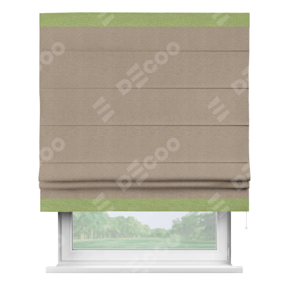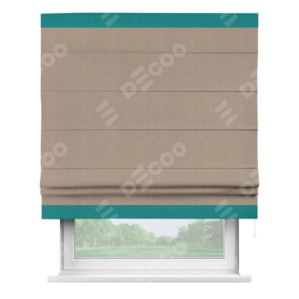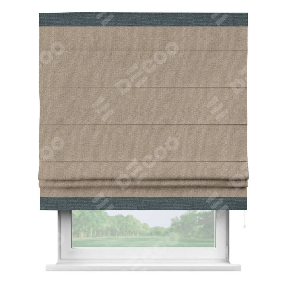 Римская штора производителя «Cortin», используется для проёма, пошита из ткани лён димаут светло-бежевый, артикул 00002. Отделка шторы кантом «Горизонт», ткань для канта используется из льна димаут разной расцветки на выбор. Имеет универсальный механизм и подходит для монтажа: на потолок, на стену и в нишу.