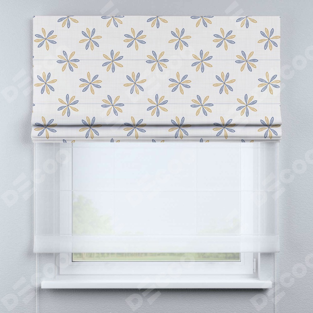 Римская штора день-ночь производителя «Cortin», используется для проёма, пошита из двух полотен, с лицевой блэкаут с нанесением сублимационной печати «Ромашки кантри», вторая ткань тюль (по стандарту комплектуется тюль белого цвета артикул V-01). Имеет универсальный механизм и подходит для монтажа: на потолок, на стену и в нишу.
