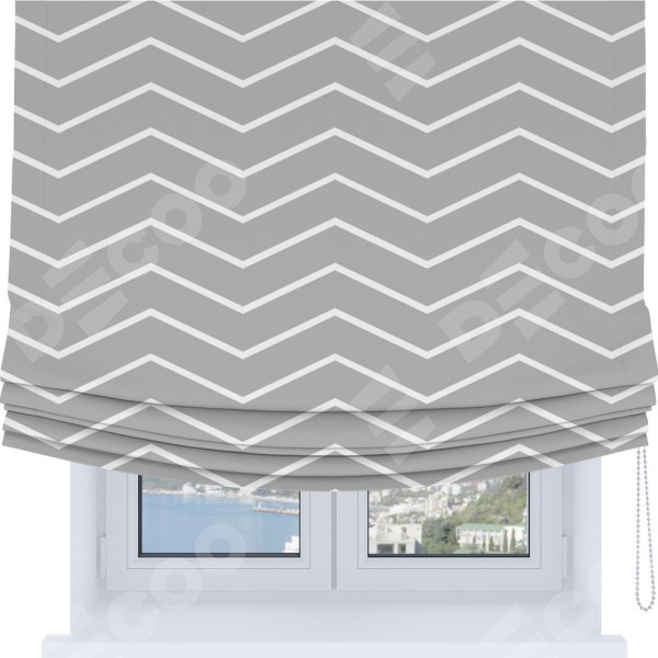 Римская штора Soft производителя «Cortin», используется для проёма, пошита из ткани блэкаут с нанесением сублимационной печати «Серый зигзаг». Имеет универсальный механизм и подходит для монтажа: на потолок, на стену и в нишу. В отличие от стандартных римских штор, римская штора Soft не имеет горизонтальных вставок и нижнего отвеса. Это позволяет ткани произвольно драпироваться в свободные мягкие складки.