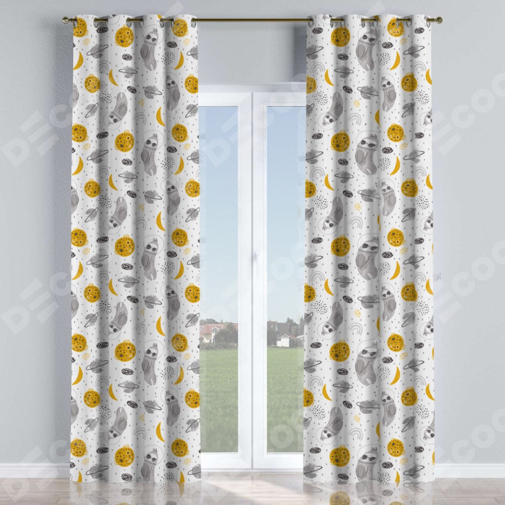 Комплект прямых штор, от производителя «Cortin», пошиты из ткани блэкаут с нанесением сублимационной печати «Ленивец в шлеме». Данная модель пошита на люверсах, комплектуется на выбор круглым карнизом и подходит для монтажа на стену или потолок. Прямые шторы на люверсах шьются по стандарту с коэффициентом 1/2 (на 100 см. ширины проёма 200 см. ширины ткани), отличительным преимуществом данной модели является простой способ монтажа. Достаточно повесить ее на трубу и штора готова!