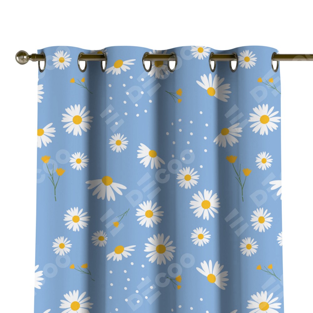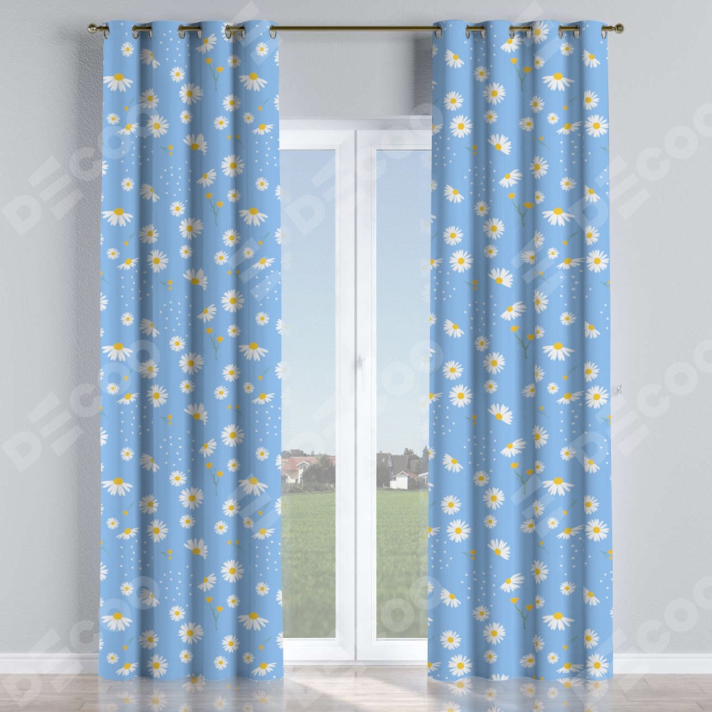Комплект прямых штор, от производителя «Cortin», пошиты из ткани блэкаут с нанесением сублимационной печати «Ромашки на голубом». Данная модель пошита на люверсах, комплектуется на выбор круглым карнизом и подходит для монтажа на стену или потолок. Прямые шторы на люверсах шьются по стандарту с коэффициентом 1/2 (на 100 см. ширины проёма 200 см. ширины ткани), отличительным преимуществом данной модели является простой способ монтажа. Достаточно повесить ее на трубу и штора готова!