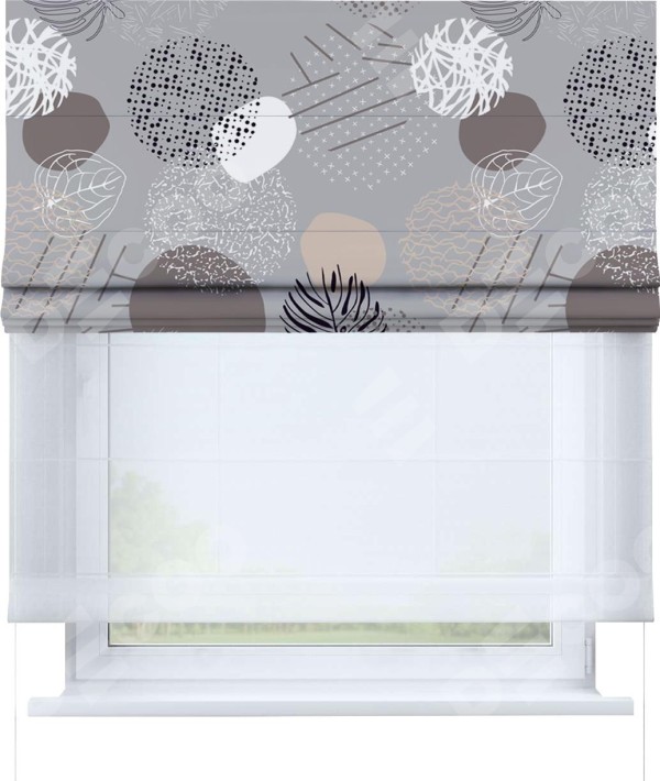 Римская штора день-ночь производителя «Cortin», используется для проёма, пошита из двух полотен, с лицевой блэкаут с нанесением сублимационной печати «Ботаника абстракция», вторая ткань тюль (по стандарту комплектуется тюль белого цвета артикул V-01). Имеет универсальный механизм и подходит для монтажа: на потолок, на стену и в нишу.