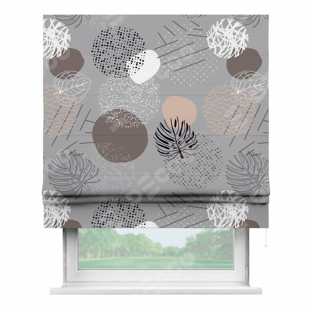Римская штора производителя «Cortin», используется для проёма, пошита из ткани блэкаут с нанесением сублимационной печати «Ботаника абстракция». Имеет универсальный механизм и подходит для монтажа: на потолок, на стену и в нишу.