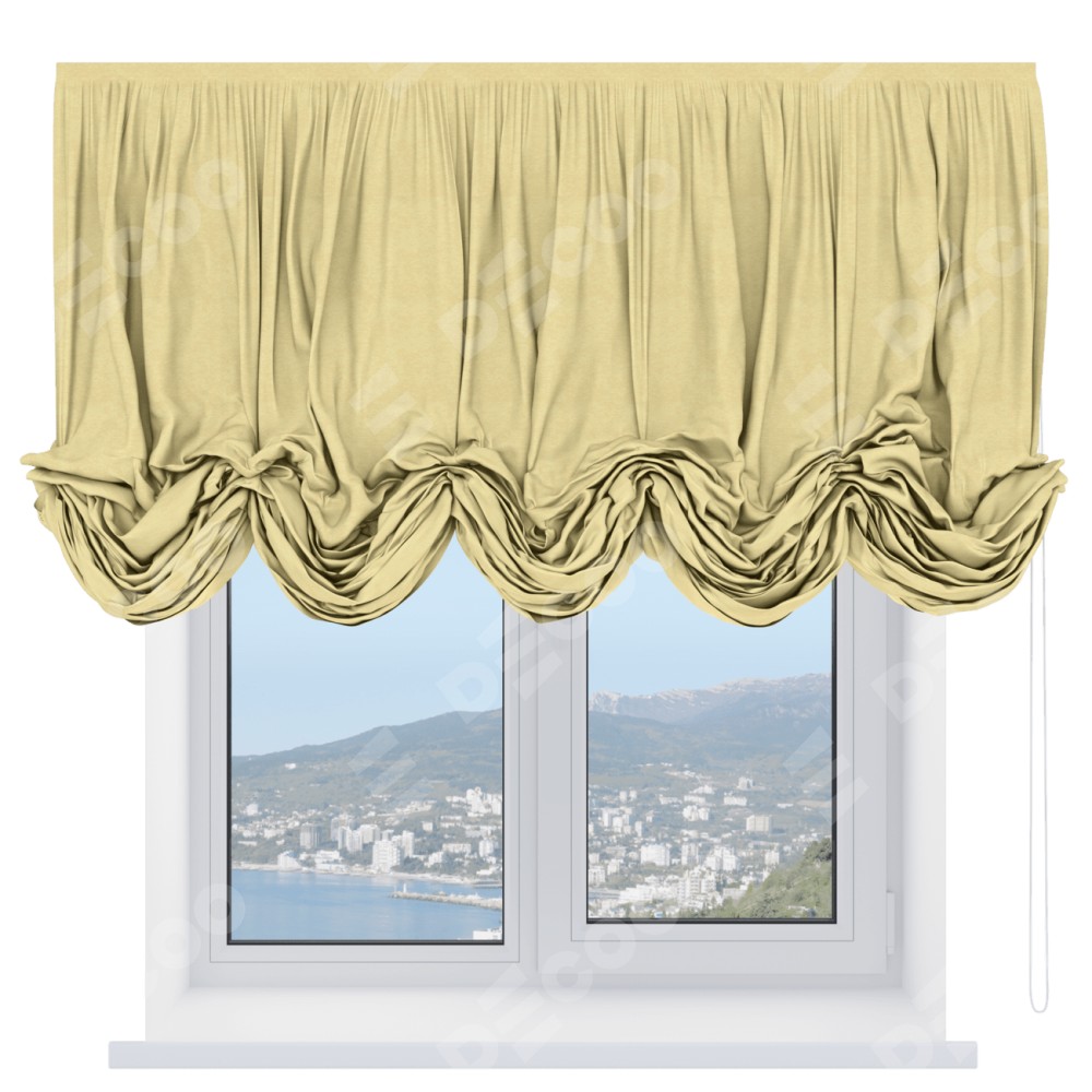 Австрийская штора производителя «Cortin», используется для проёма, пошита из ткани софт однотонный золотой, артикул ткани 42934. Имеет универсальный механизм и подходит для монтажа: на потолок и на стену.