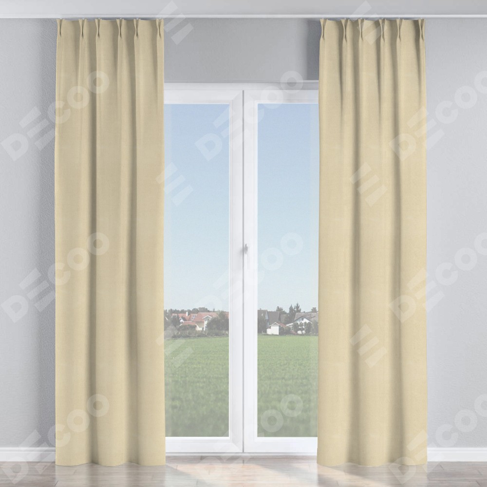 Комплект прямых штор, от производителя «Cortin», пошиты из ткани блэкаут однотонный бежевый, артикул ткани 13125. С изнаночной стороны в верхней части штор пристрачивается шторная лента с декоративными складками «Кустик». Для создания элегантных складок прямые шторы шьются по стандарту с коэффициентом 1:2 (на 100 см. ширины проёма 200 см. ширины ткани).
