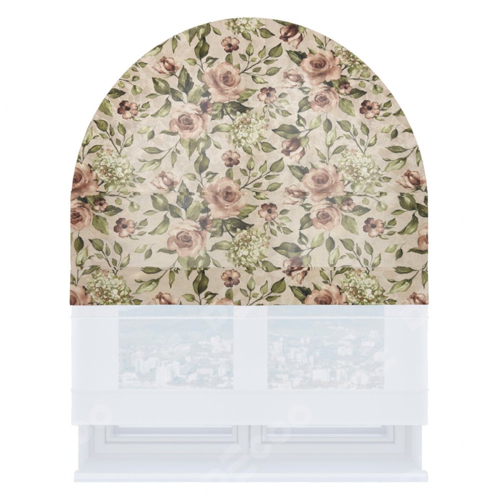 Римская штора день-ночь производителя «Cortin», используется для арочного проёма, пошита из двух полотен, с лицевой стороны «Розы бежевые» артикул 34564, вторая ткань тюль (по стандарту комплектуется тюль белого цвета артикул V-01). Штора шьётся по индивидуальным размерам, для данного типа римской шторы возможная ширина от 60 до 300 см. Удобное управление каждой шторой отдельно.