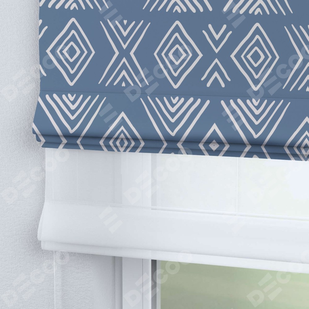 Римская штора день-ночь производителя «Cortin», используется для проёма, пошита из двух полотен, с лицевой блэкаут с нанесением сублимационной печати «Графический орнамент», вторая ткань тюль (по стандарту комплектуется тюль белого цвета артикул V-01). Имеет универсальный механизм и подходит для монтажа: на потолок, на стену и в нишу.