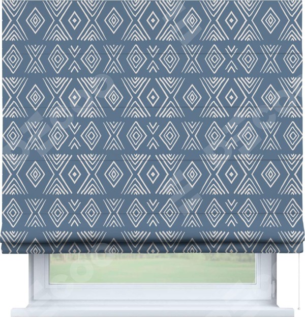 Римская штора производителя «Cortin», используется для проёма, пошита из ткани блэкаут с нанесением сублимационной печати «Графический орнамент». Имеет универсальный механизм и подходит для монтажа: на потолок, на стену и в нишу.
