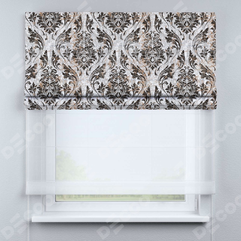 Римская штора день-ночь производителя «Cortin», используется для проёма, пошита из двух полотен, с лицевой блэкаут с нанесением сублимационной печати «Дамаск тёмный», вторая ткань тюль (по стандарту комплектуется тюль белого цвета артикул V-01). Имеет универсальный механизм и подходит для монтажа: на потолок, на стену и в нишу.