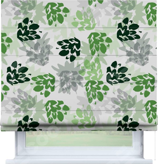 Римская штора производителя «Cortin», используется для проёма, пошита из ткани блэкаут с нанесением сублимационной печати «Зелёный луг». Имеет универсальный механизм и подходит для монтажа: на потолок, на стену и в нишу.