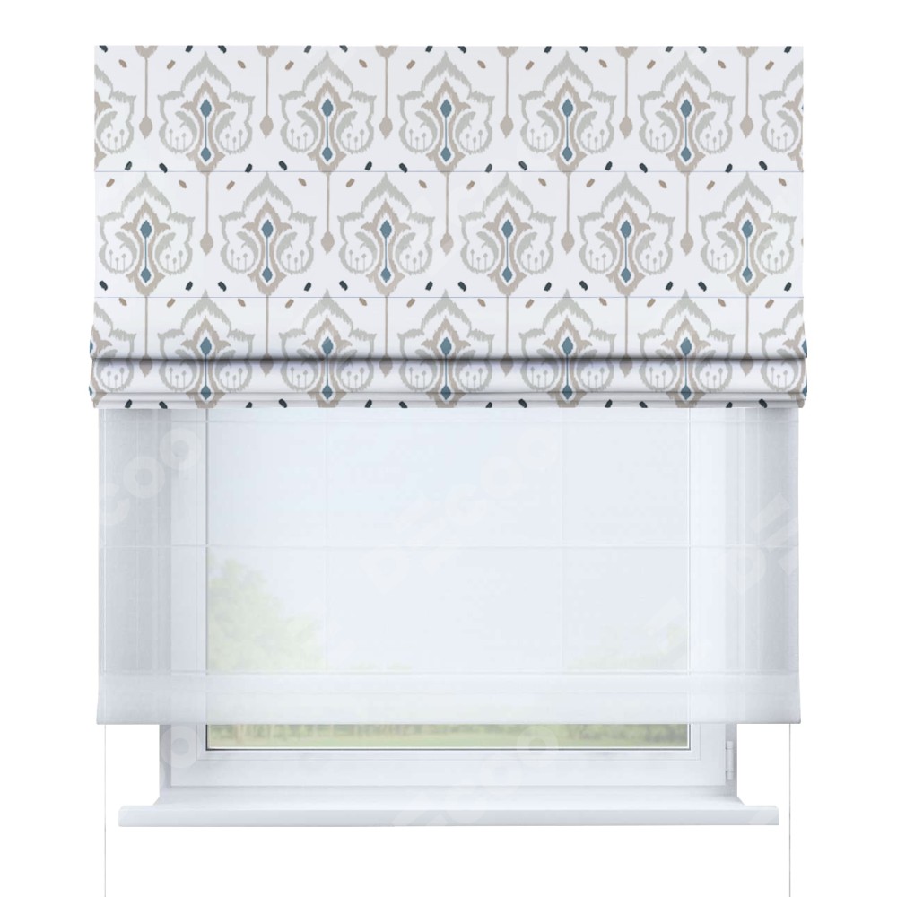 Римская штора день-ночь производителя «Cortin», используется для проёма, пошита из двух полотен, с лицевой блэкаут с нанесением сублимационной печати «Икат узор», вторая ткань тюль (по стандарту комплектуется тюль белого цвета артикул V-01). Имеет универсальный механизм и подходит для монтажа: на потолок, на стену и в нишу.