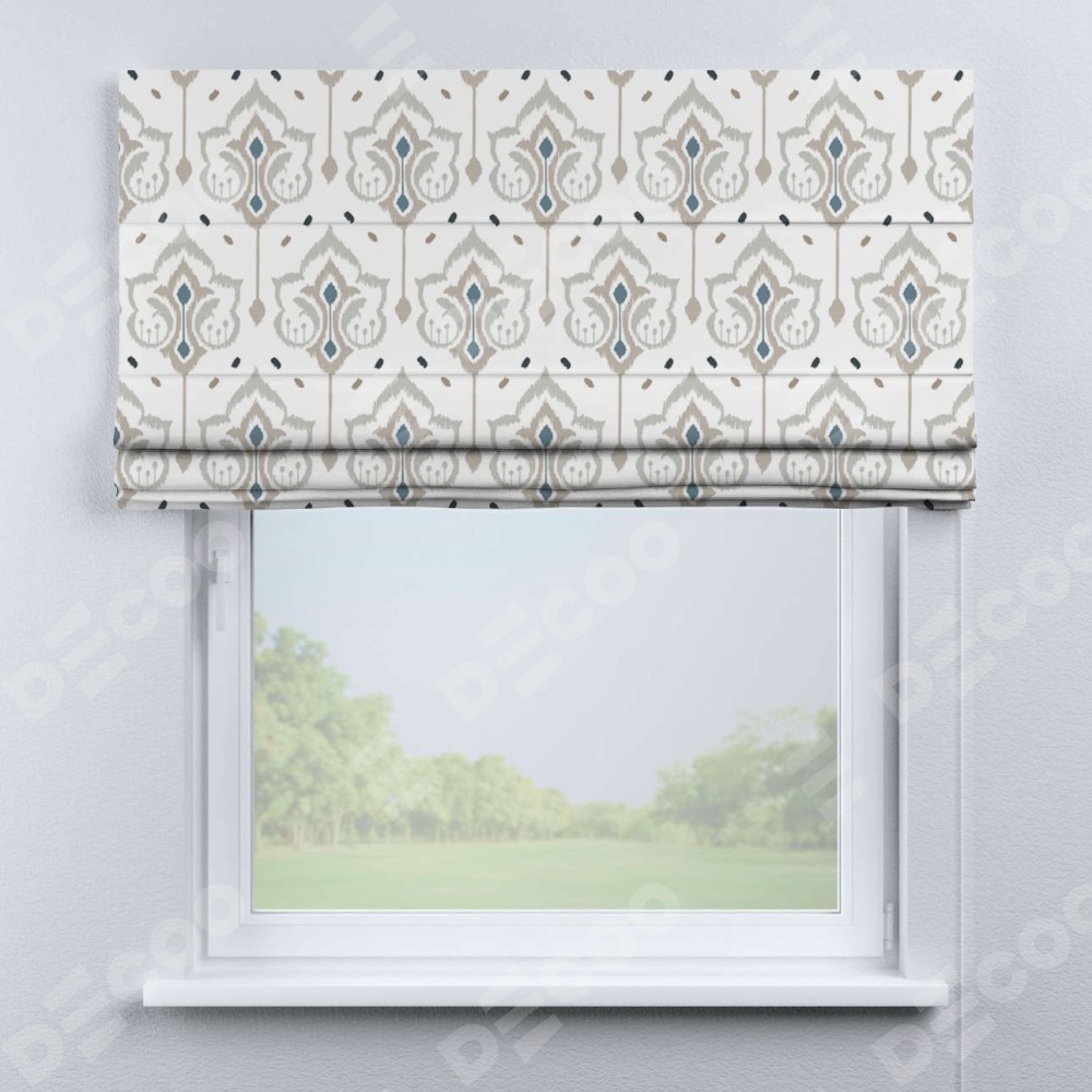 Римская штора производителя «Cortin», используется для проёма, пошита из ткани блэкаут с нанесением сублимационной печати «Икат узор». Имеет универсальный механизм и подходит для монтажа: на потолок, на стену и в нишу.