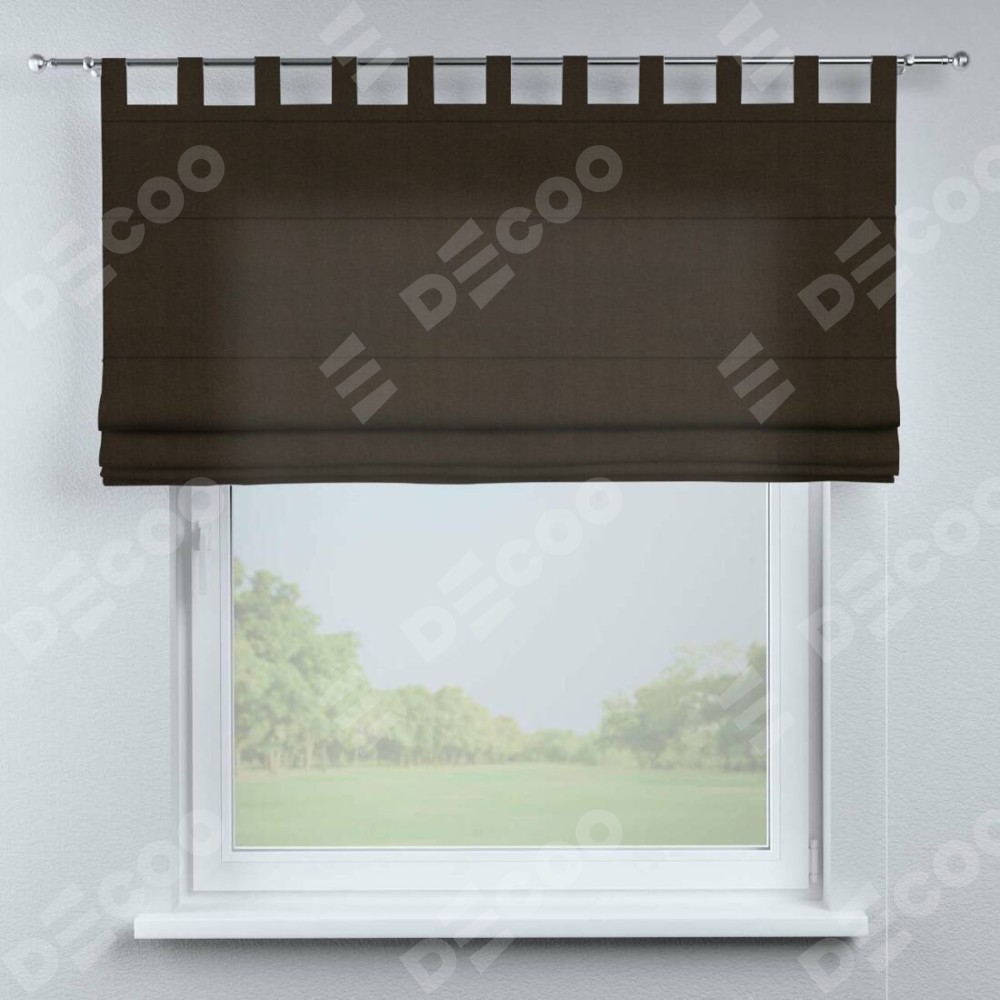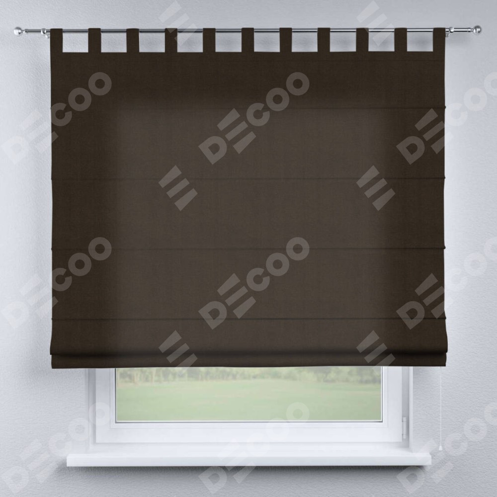 Римская штора производителя «Cortin», используется для проёма, пошита из ткани вельвет тёмно-коричневый, артикул ткани 30991. Данная модель пошита на петлях, комплектуется на выбор круглым карнизом и подходит для монтажа на стену. Римская штора на петлях имеет простую систему регулировки высоты, отличительным преимуществом данной модели является простой способ монтажа. Достаточно повесить ее на трубу и штора готова!